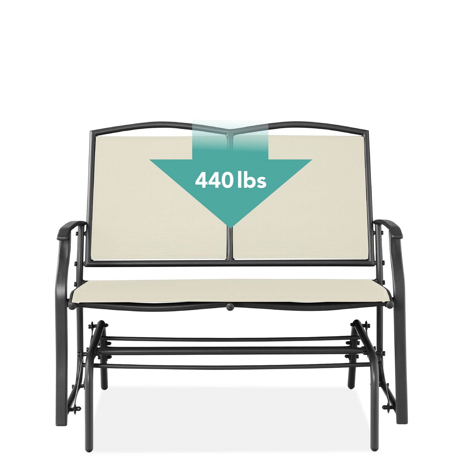 Glide into spring/summer with this 2 Seater Mesh Patio Loveseat Swing Glider Rocker with Armrests in Off White. Built with ergonomic armrests and robust textilene fabric which conforms to your body to provide a comfortable bench for hours of relaxation. The sturdy, yet light frame allows you to turn your patio, garden, balcony, or porch. Classic swing glider features a 38-inch loveseat to support you and your favorite guest-up to 440-pound capacity. Fade- and weather-resistant textilene fabric woven over a powder-coated steel frame provides lasting quality and comfort. A steel spring and pivot system lifts the seat to provide a smooth rocking motion while you relax in comfort
