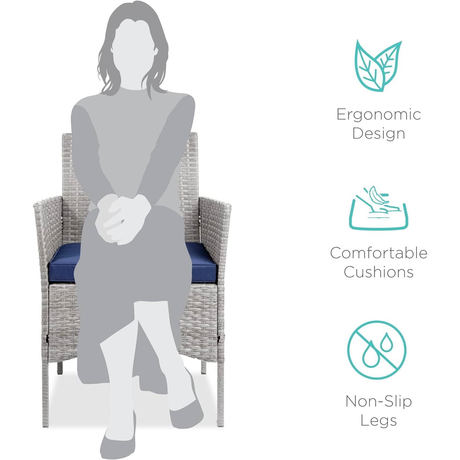 This 3-Piece Grey PE Wicker Outdoor Patio Furniture Dining Set w/ Navy Blue Cushions is a space-saving set of chairs with a matching accent table transform your patio, porch, or balcony into a charming bistro or chic lounge. Both chairs combine a wide backrest with high armrests for added comfort and support, while non-slip feet add stability. A 17-inch table features a storage compartment for your drinks, magazines, or other accessories, while a removable glass tabletop ensures easy cleanup. A set of sufficiently padded cushions feature removable, spot washable covers for easy maintenance. All-weather wicker on a durable steel frame guarantees long-lasting, high-quality seating; CHAIR DIMENSIONS: 23"(L) x 21.75"(W) x 32.25"(H); TABLE DIMENSIONS: 15.5"(L) x 15.5"(W) x 17.75"(H); Chair Weight Capacity: 250 lbs.; Table Weight Capacity: 50 lbs.