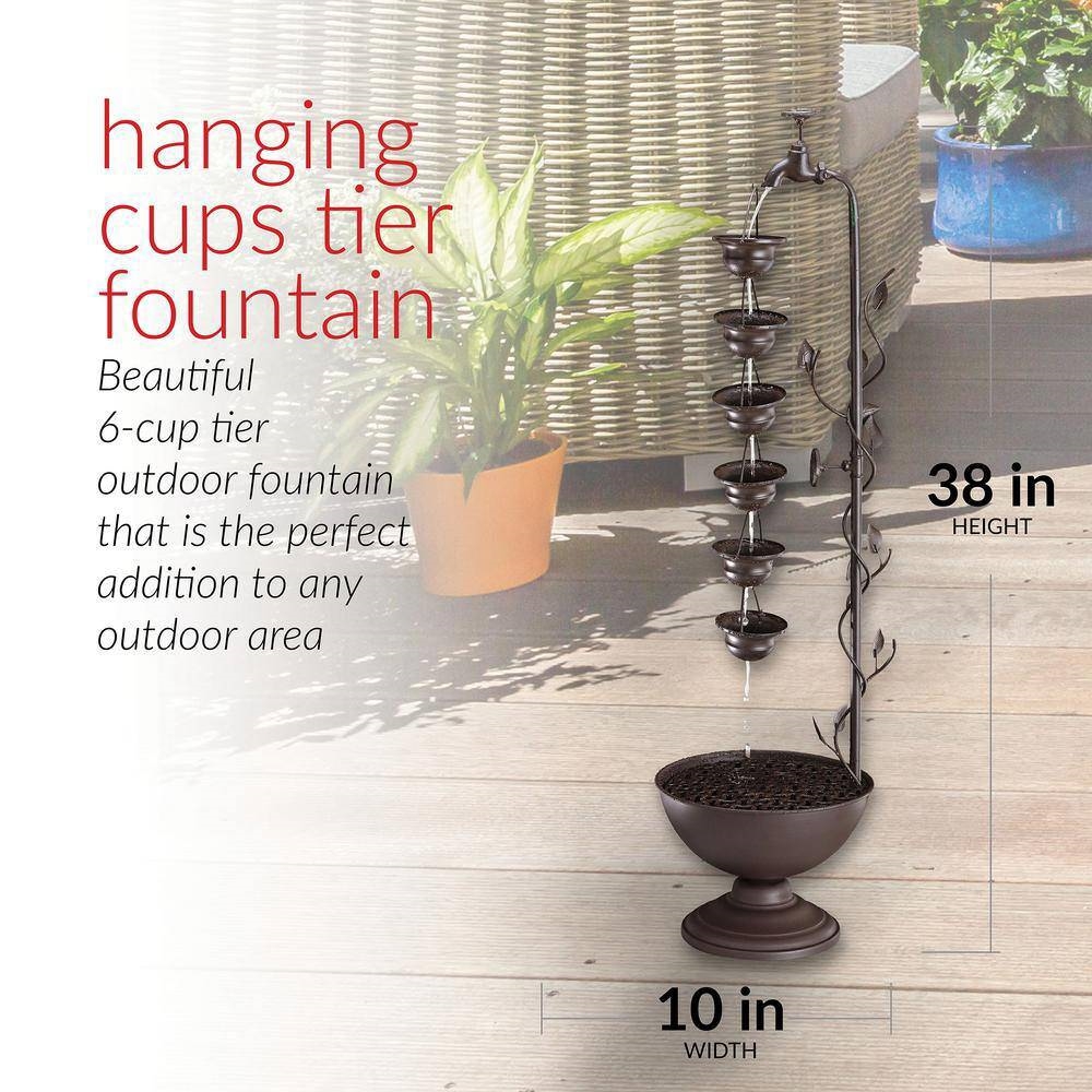 This Outdoor Indoor 6-Tier Hanging Cups Water Fountain in Bronze Finish is the perfect addition to your decor, and features an interior pump that keeps the water flowing - just plug it in! Water trickles down through cups to mimic the sounds of a real waterfall, adding a peaceful ambiance to your home or yard. Rustic dark bronze and green color scheme offers vintage accents for a stylish antique look. Iron construction is rust- and weather-resistant to keep your outdoor fountain looking new over time. The water fountain measures 10"L x 11"W x 38"H, the perfect size for your yard, and includes a two-year manufacturer's warranty from the date of purchase.