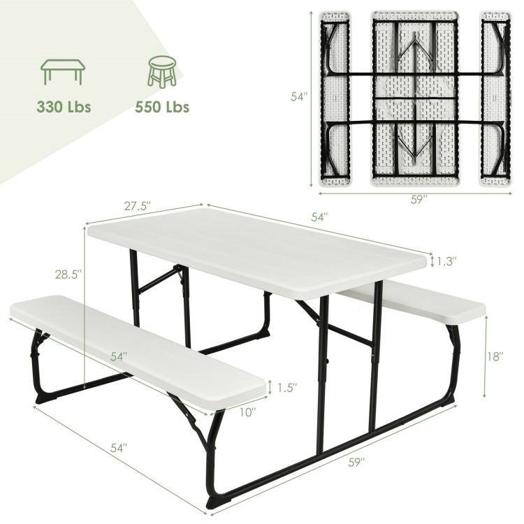 Measuring 54" x 28"(L X W), this Folding White HDPE Picnic Table with 2 Benches Outdoor Patio Furniture Set features large desktop to support all kinds of food and tableware needed for picnic. The bench is long enough to accommodate 4 adults or 6 children at the same time without being crowded. It's ideal for family parties or camping trips. The folding camping table has a thoughtful folding function, which occupies less space, allowing you to store it indoors to keep it away from bad weather. The transformation of the table is quite simple. Anyone can easily transform it from a folded desk to a picnic table in just 5 steps. The frame of this picnic table with bench set is made of thickened rustproof steel pipes, so it is durable and robust enough to company with you for a long time. The elegant wood grain desktop is made of HDPE. It's waterproof and wear-resistant, and can be easily cleaned. This folding table is designed for multi-purpose use, particularly suitable for a variety of indoor and outdoor uses. For example, it can work as a BBQ dining table, game table, camping table, picnic table, study table, etc. No matter where you need a table, this folding table can be a correct solution. The folding picnic table has few parts, which are individually packaged to prevent them from getting lost. All installation tools are included. Follow the detailed instruction step by step, you can put it together or tear it down within a few minutes.