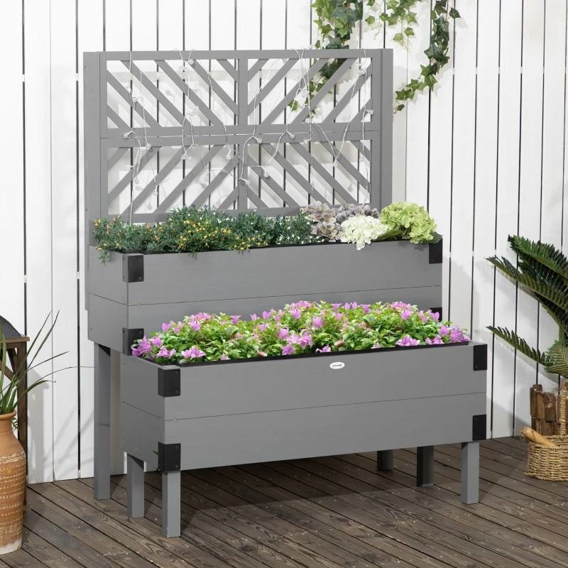 Grow BIG at home with this 2 Tier Grey Lattice Trellis Self Draining Wooden Garden Raised Planter Box! This garden bed kit offers 2 troughs so you have extra space to organize and plant. The raised design keeps plants up and away from weeds and wild animals while keeping you from bending and stooping, which could lead to back strain. The back wall of our vegetable garden bed doesn't just offer decorative flair, it also helps support climbing plants, and offers a space for you to hang plant pots. The corners of each raised garden box are reinforced with metal brackets. Combined with a solid wood frame, these brackets help them hold more soil and provide a more robust resistance to weather conditions. The bottom of each box offers a water draining hole protected with nonwoven fabric. This combination prevents plants from waterlogging by draining out excess water without risking soil erosion.