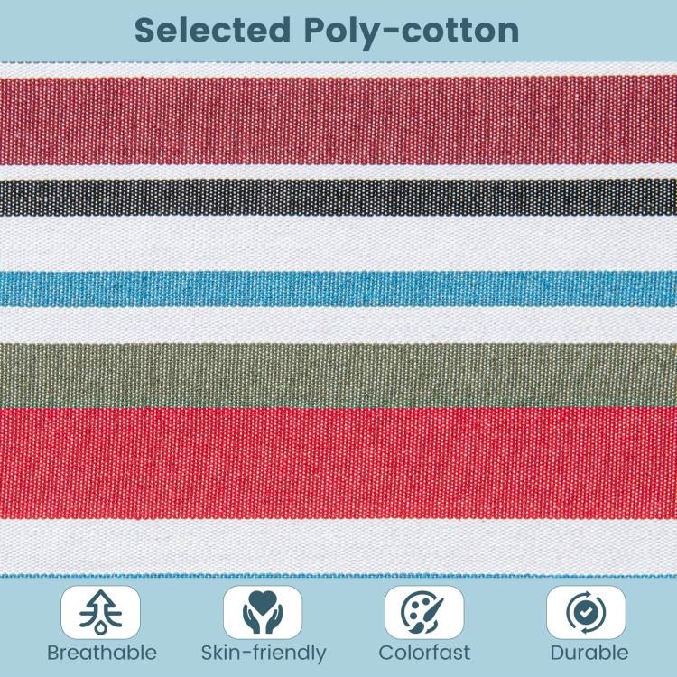 This Indoor/Outdoor Portable Poly Cotton Hammock with Stand and Carrying Case has advantages of being breathable, skin-friendly, colorfast and durable. Besides, the hand-woven ropes and wood spreader bars ensure extra durability and stability. This sturdy metal stand features stable hooks, reinforced connections, rustproof metal tubes and non-slip foot pads, which comes with strong loading capacity up to 330 lbs.