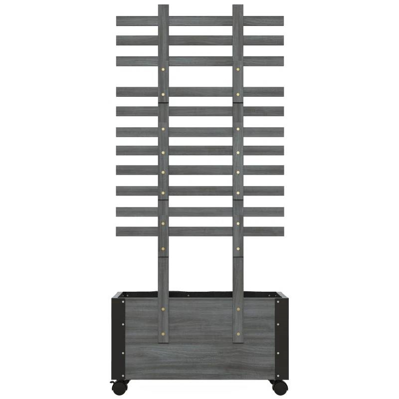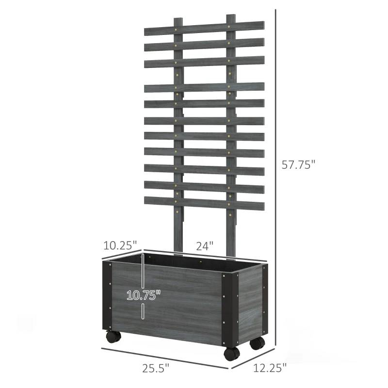 Grow time! This FarmHouse Rustic Grey Wheeled Wooden Raised Garden Bed Planter with Trellis is made of classy, carbonized fir wood and reinforced with double-layered metal corners. The corners are powder coated to provide extra resistance against water. Together these materials add up to a 77 lbs. weight capacity you can wheel almost anywhere. This raised flower bed is a 2-in-1 planter box and trellis. Use it inside or bring it outdoors. It's excellent for climbing plants like grape vines, tomatoes, and sweet potatoes or decorative delights like ivy or morning glory. Our trellis is also excellent indoors as a place for keyrings, string lights, and other knickknacks. With our above ground garden box, you won't have to stay in a place, that's because it comes with four universal wheels (two with brakes). Have an herb planter that you can move in and out of the sunroom. Offer plants time in a greenhouse. Take it out for the winter, then get it out in the garden for spring. Why worry about excess water if it can handle itself? Keep soil fresh and protect your plants from water logging with a self-draining design. Internal non-woven fabric helps our trellis planters stop soil from falling away (please use something of adequate size under it to catch falling water when using it inside).