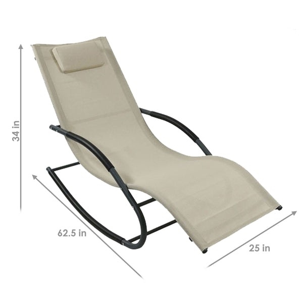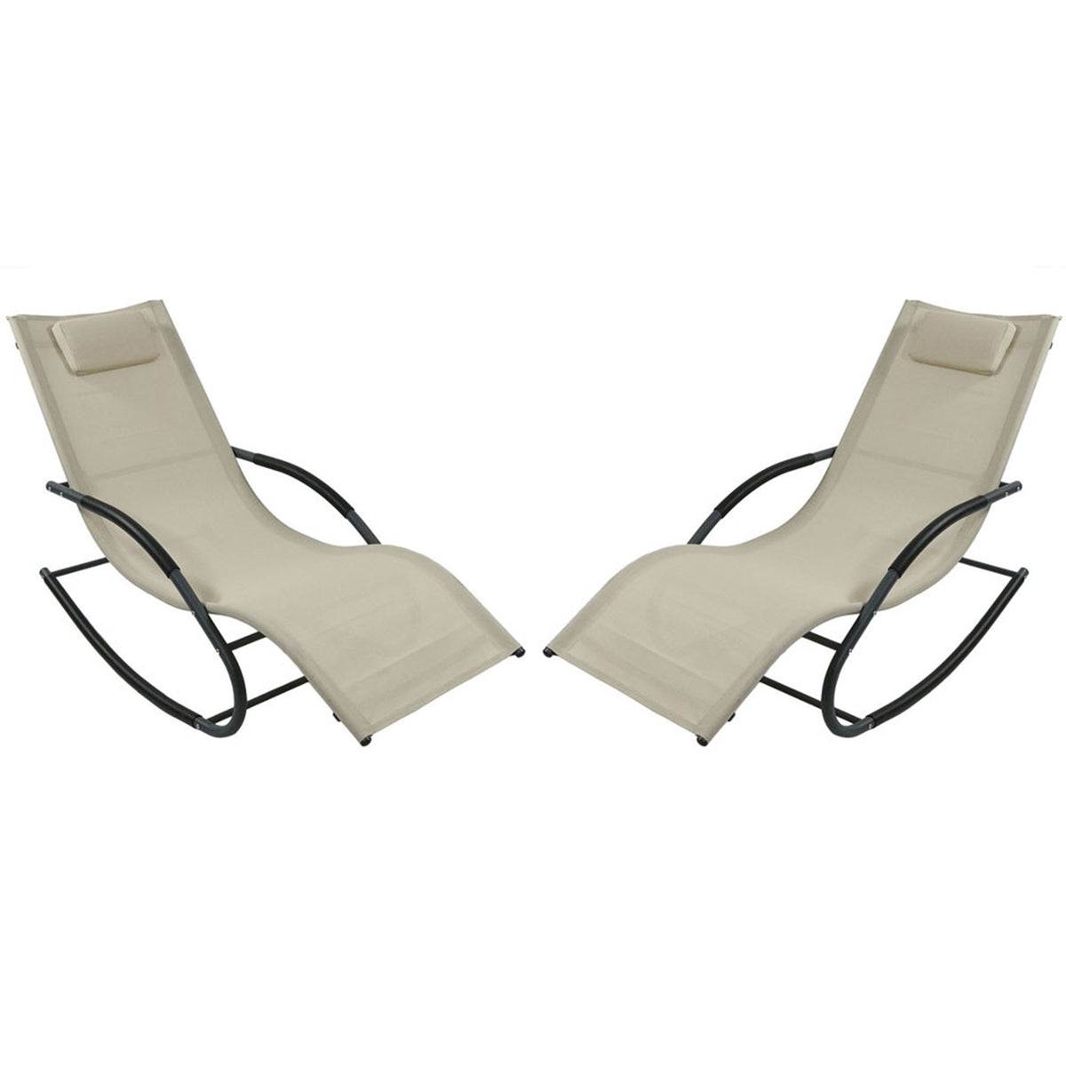 Add comfort and sleek contemporary charm to your space with this Set of 2 - Rocking Chair Chaise Patio Lounger with Pillow, Beige. These rocking chairs are specifically designed for placement in the outdoors, as they feature weather-resistant 70% vinyon and 30% polyethylene seat material. Plus, they come with a pillow that attaches and detaches with hook and loop fasteners so you have added head support.