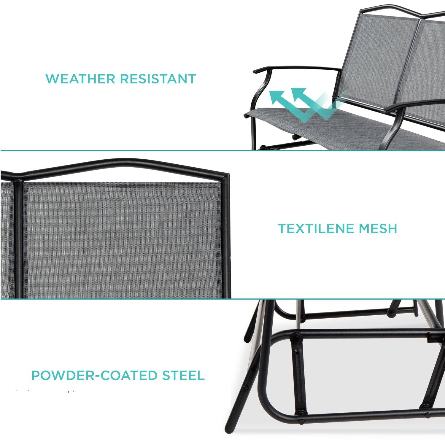 Glide into spring/summer with this 2 Seater Mesh Patio Loveseat Swing Glider Rocker with Armrests in Grey! Built with ergonomic armrests and robust textilene fabric which conforms to your body to provide a comfortable bench for hours of relaxation. The sturdy, yet light frame allows you to turn your patio, garden, balcony, or porch. Classic swing glider features a 38-inch loveseat to support you and your favorite guest-up to 440-pound capacity. Fade- and weather-resistant textilene fabric woven over a powder-coated steel frame provides lasting quality and comfort. A steel spring and pivot system lifts the seat to provide a smooth rocking motion while you relax in comfort