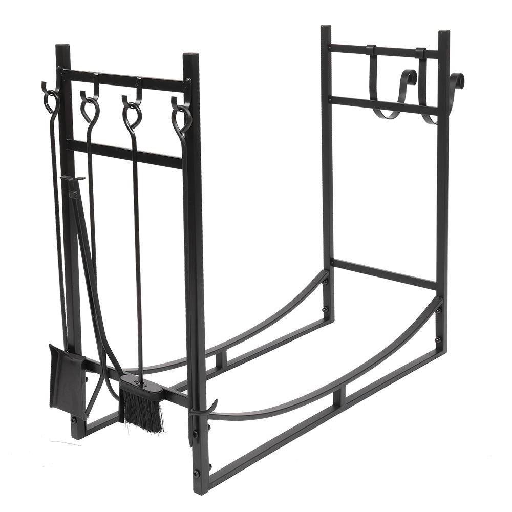 Black Metal Firewood Holder Log Rack with Poker Shovel Tongs and Broom