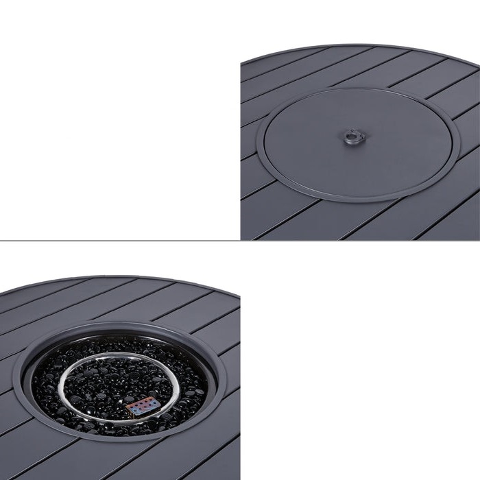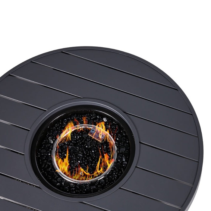 Make your winters warm and cozy with this 50,000 BTU Grey Wicker Round LP Gas Propane Fire Pit w/ Faux Wood Tabletop and Cover. A table free of corners is an ideal option when children are present, while making conversations easier to carry on in a cozier, more intimate setting. Remove the lid from the built-in side hooks and cover the pit to add more space for family and friends to enjoy a light meal, or carefully chow down around a warm fire. Change and conceal your gas tank quickly with a convenient side door; works with a standard 20-pound propane tank at 50,000 BTUs. Propane tank is NOT included. A securing strap also helps prevent shifting. Take off the center lid and ignite an inviting flame over a removable bed of glass beads that trap and disperse heat. A durable nylon cover is included to help ensure this wicker fire pit table with heavy-duty, weather-resistant steel frame will withstand the elements when not in use.