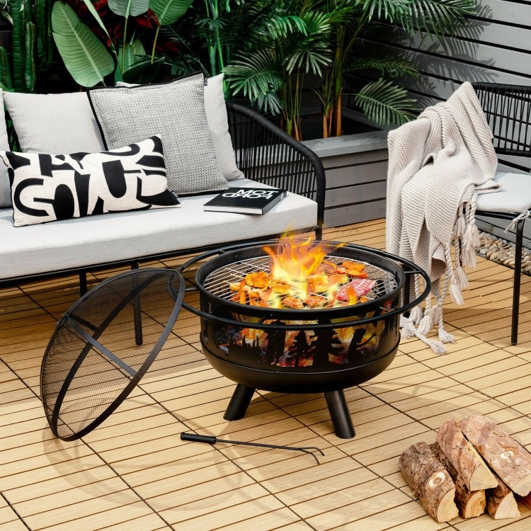 The Portable Patio Screened Wood Burning Fire Pit Cooking Grill with Poker is constructed of high-grade and well-coated iron, which is resistant to deformation, crack, rust and high temperature for long service life. The deep fire bowl allows more logs for prolonged heating. Whether you want to keep warm in cold winter or have a barbecue outdoors, this fire pit gets the job done every time. Comes with a fire poker and spark screen cover.