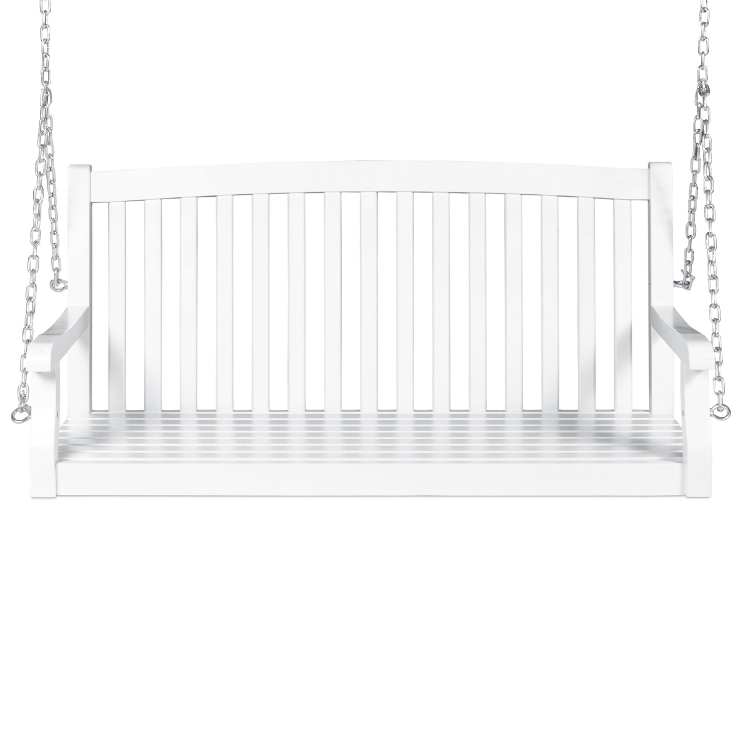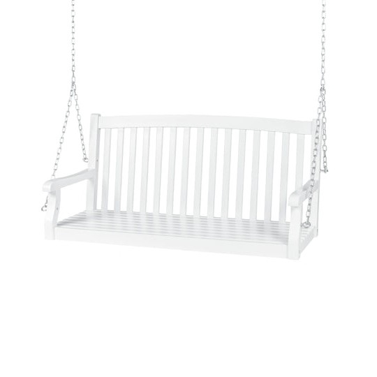Swing into summer with the White Acacia Wooden Curved Back Hanging Porch Swing Bench with Mounting Chains. Naturally weather-resistant acacia wood with a set of zinc-oxide coated steel chains. Built with an open design to resist the wind, a set of armrests, and an extra-thick seat to maintain balance while adding a nostalgic touch to your outdoor seating. A weighted seat combined with four anchor points and two steel mounting chains prevent this seat from tipping over no matter the wind or seating balance.