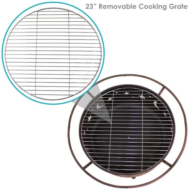 Moon Stars Sky Steel Fire Pit Fire Poker Included Weather Resistant: Yes Material: Steel with High-Temp Paint Finish Powder Coated Finish: Yes Fuel Type: Charcoal; Wood Burning 23-inch Removeable Cooking Grill Grate Included Spark Screen Included Outdoor Use Only Assembly Required 1 Year Manufacturer's Warranty This item has 0.75-millimeter steel Leg length: 5.5 inches Bowl sits 5.25" from the ground. Overall Dimensions: 29.5W x 29.5D x 20H inches Fire Bowl: 24W x 24D x 10H inches Product Weight: 21 lbs.