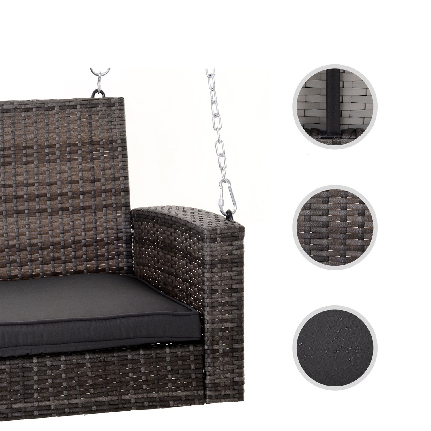 This Grey Tones Wicker Porch Swing 7ft Hanging Chain with Dark Grey Padded Cushion has so much Southern charm it practically welcomes your guests and brings out a pitcher of sweet tea for you. Its generous size with curved armrests, a high back rest with super padded charcoal cushion, makes this classic 2 person porch swing a great backyard or porch addition.