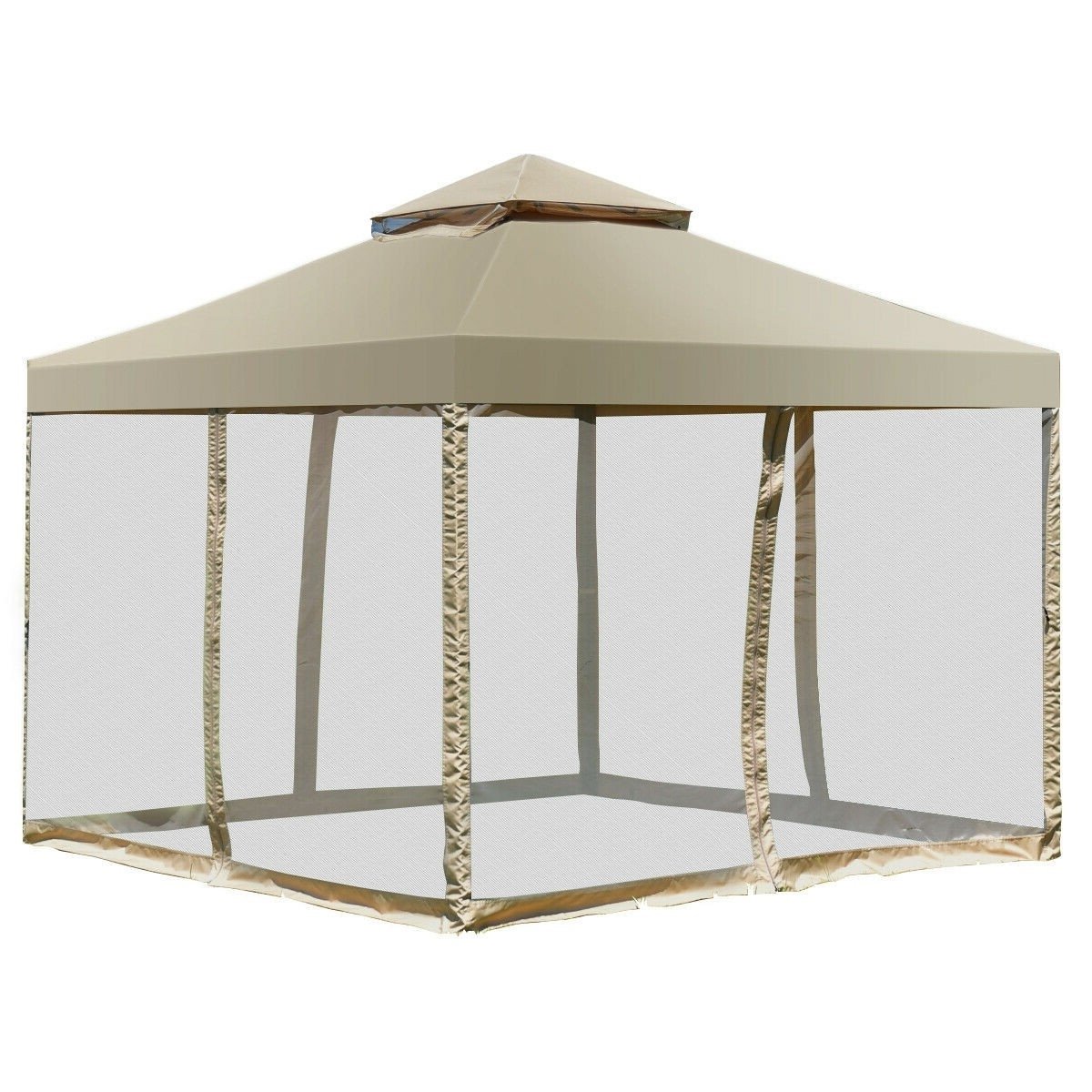 10 x 10 Ft Outdoor Gazebo with Tan Brown Polyester Canopy and Mesh Side Walls