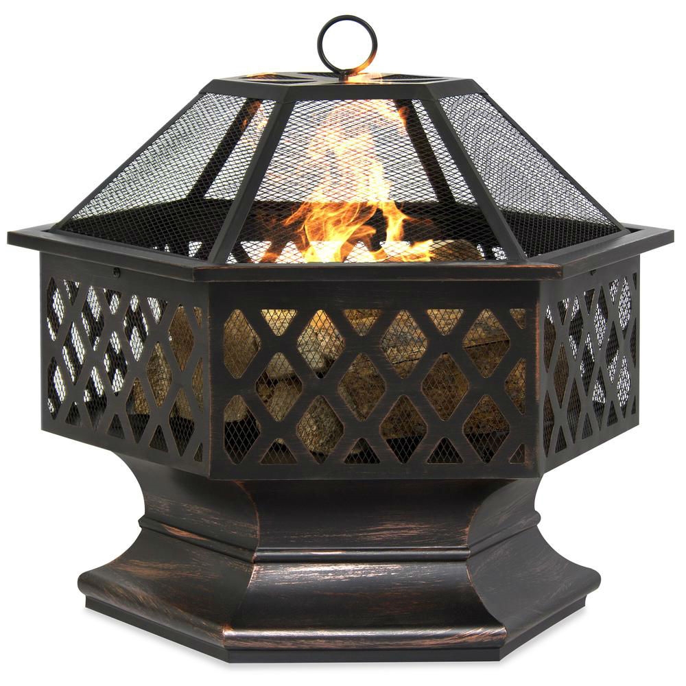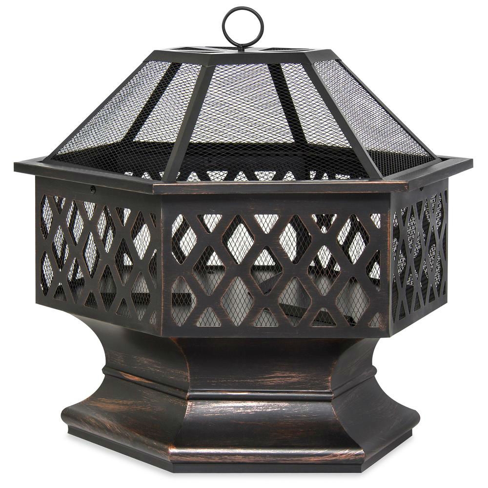 Spend time with family and friends around this outdoor fire pit. The beautiful, distressed bronze finish and lattice pattern on this steel hex-shaped pit adds a rustic touch to any area. With a bowl deep enough to hold plenty of wood and a lid to help contain ashes, stay warm and comfortable through the night.