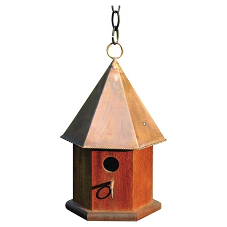 This Solid Mahogany Wood Songbird Birdhouse with Shiny Copper Roof has a stylish hexagonal body of solid cypress and a six sided roof. Remove roof and clean out debris, spray with a mild bleach and water solution then rinse thoroughly and let dry in the sun.