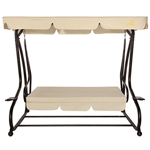 This Outdoor 3-Seat Canopy Swing with Beige Cushions for Patio Deck or Porch combines comfort, durability and beauty for a great addition to any porch or patio. Built from premium materials such as steel for the frame, Textilene for the mesh seat, and PA-coated polyester for a water and fade resistant canopy. This bench seats three with a maximum combined weight of 530lbs. What's more, this model converts into a lay flat futon style bed, and features a small cup holder and tray on each side.