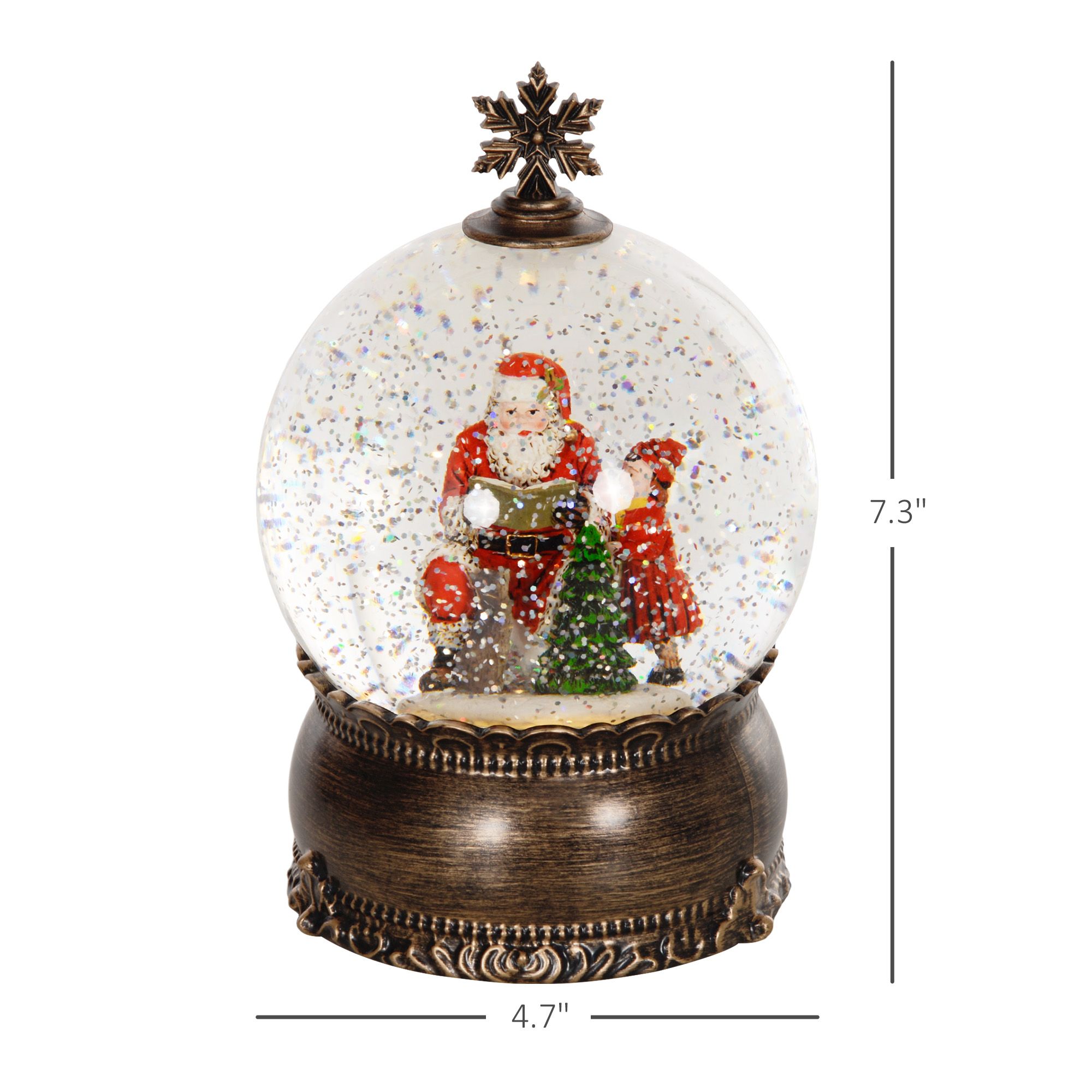5.- Light up Snow Globe Info: Overall Dimensions: 4.7" L x 4.7" W x 7.3" H. 3 x AA battery required (not included). No assembly required.