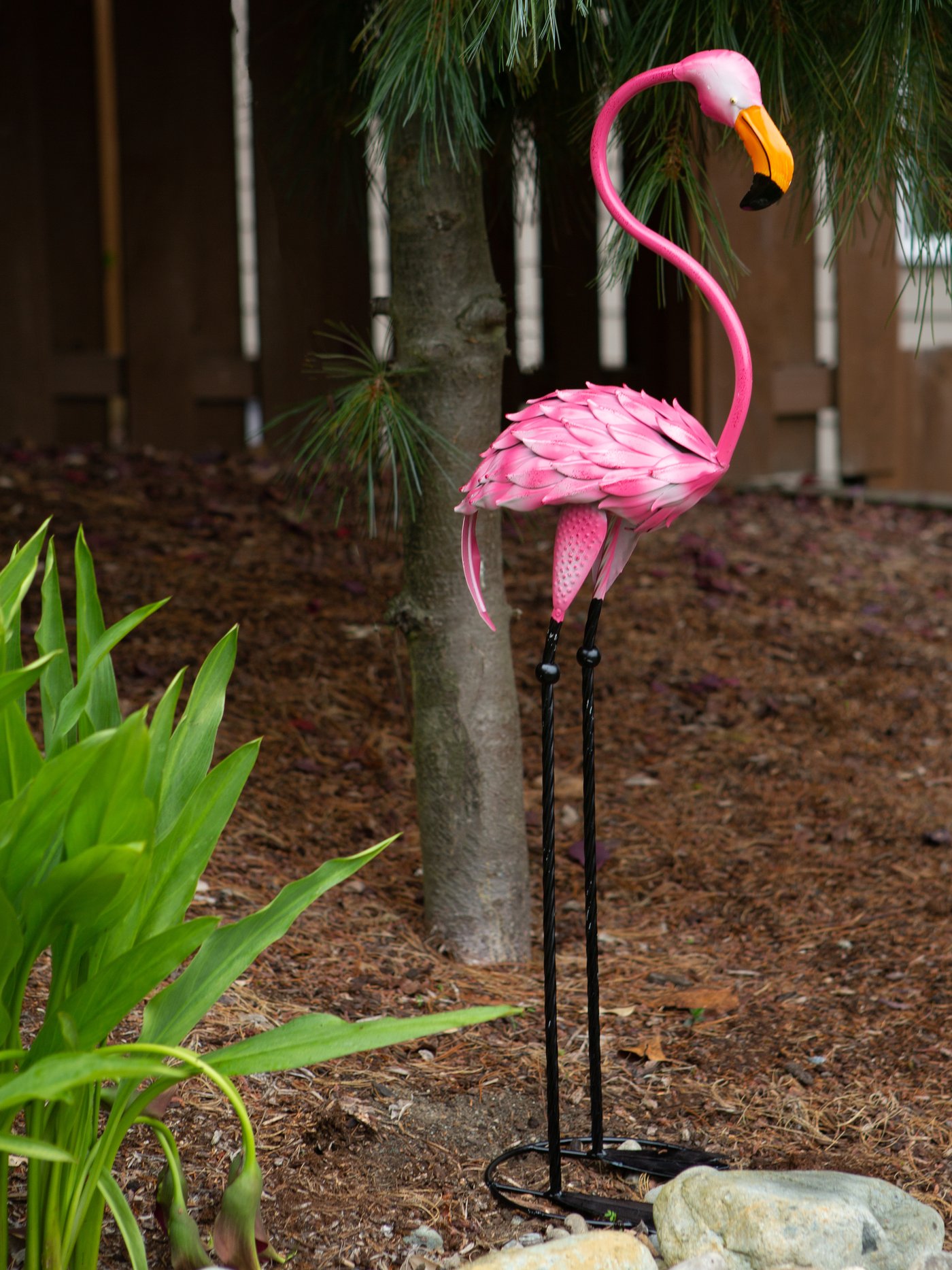 Irresistibly charming metal flamingo sculpture brightens any room with a taste of the tropics. This statement statue is a great addition to your front walk, garden, or patio!