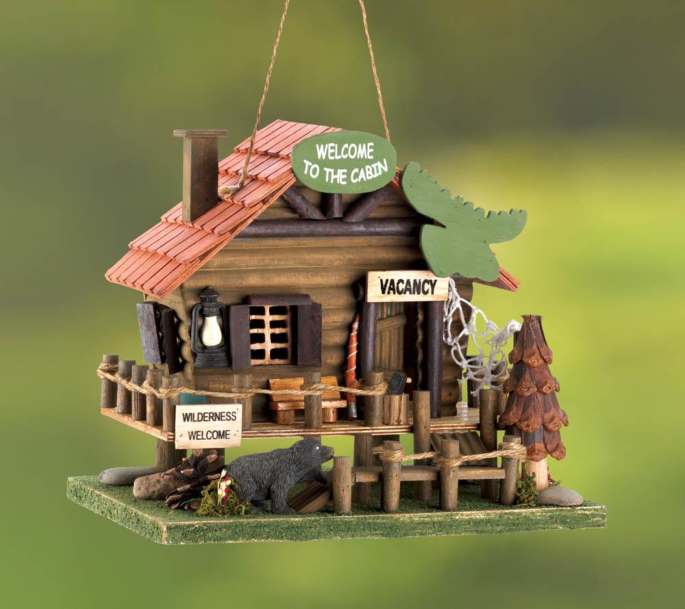 Let the call of the wild welcome birds into your yard with this adorable log cabin birdhouse. Fashioned after a vacation rental in the heart of the wilderness, it features rustic accents, including a moose head sign, rope fencing, and a cute black bear cub on the prowl.