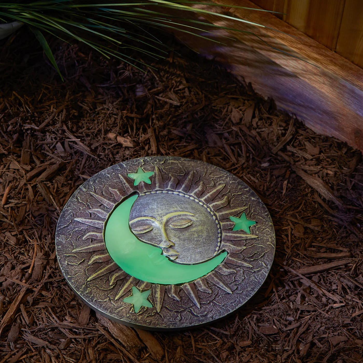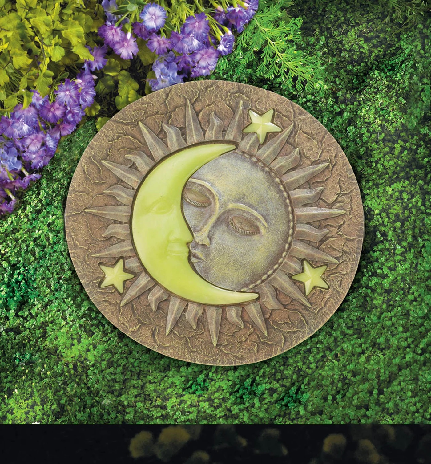 The sun and moon, together in harmony, are both a welcome presence in your garden or yard. This cool polyresin stepping stone features the sun and a yellow crescent moon, along with a few yellow stars. The moon and stars will glow at night after soaking up some sunlight during the day.