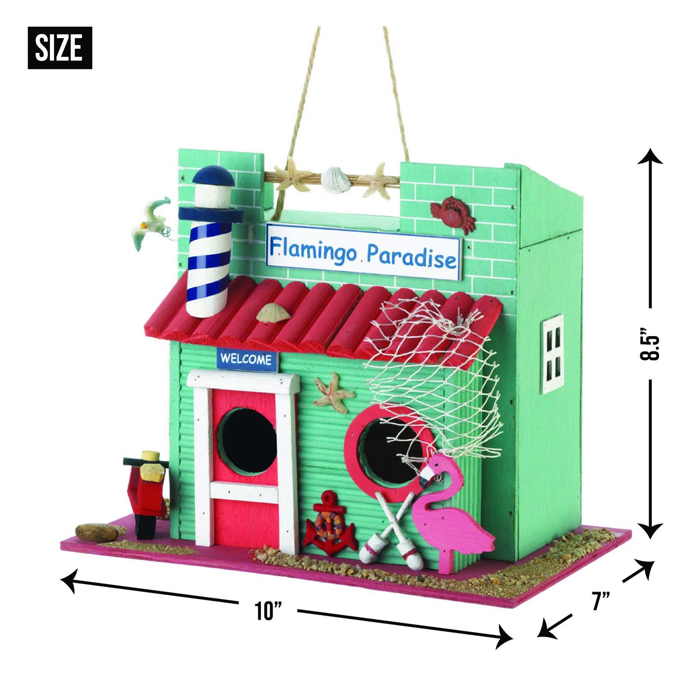 A fun flamingo hangout by the sea, this novelty birdhouse welcomes your fine feathered friends. Seafoam blue, navy and bright coral hues make this birdhouse a cute conversation piece.