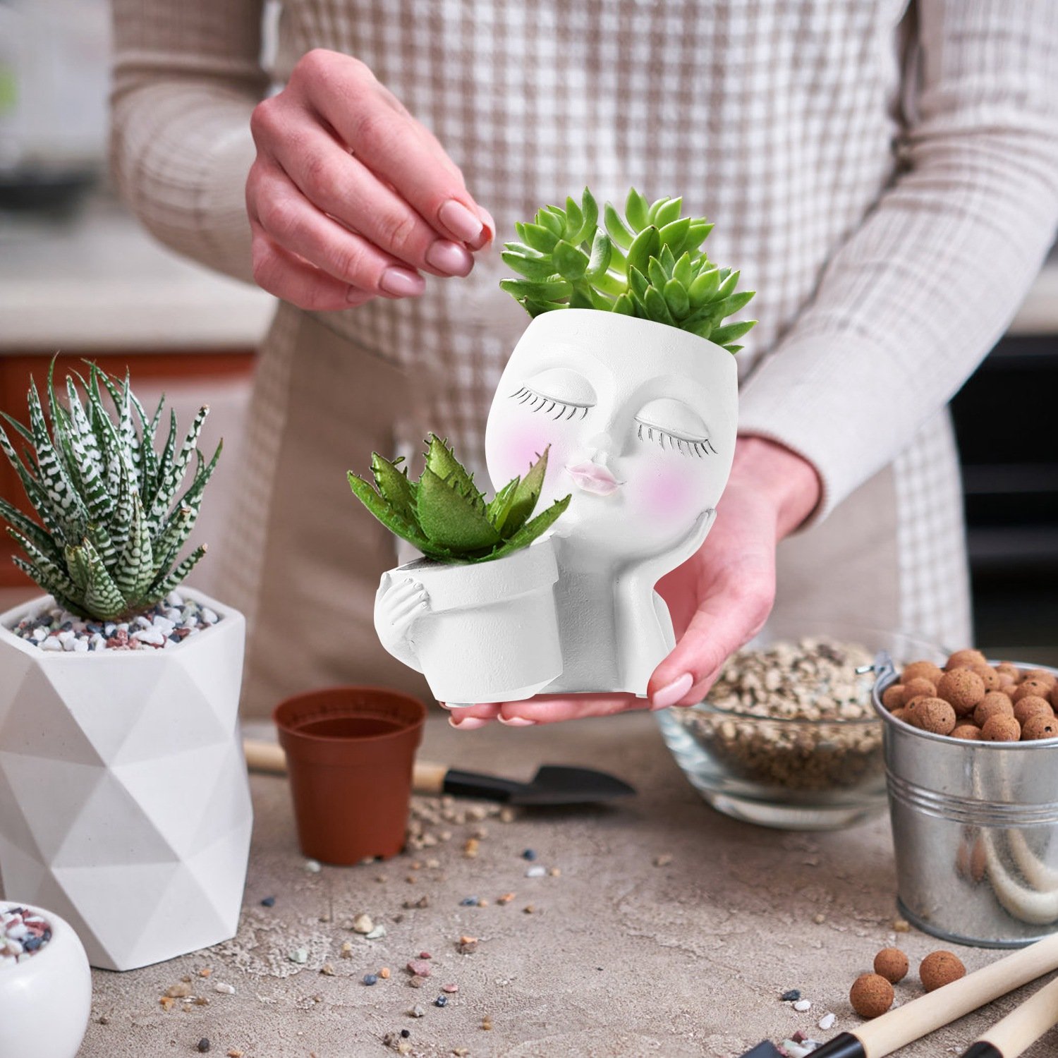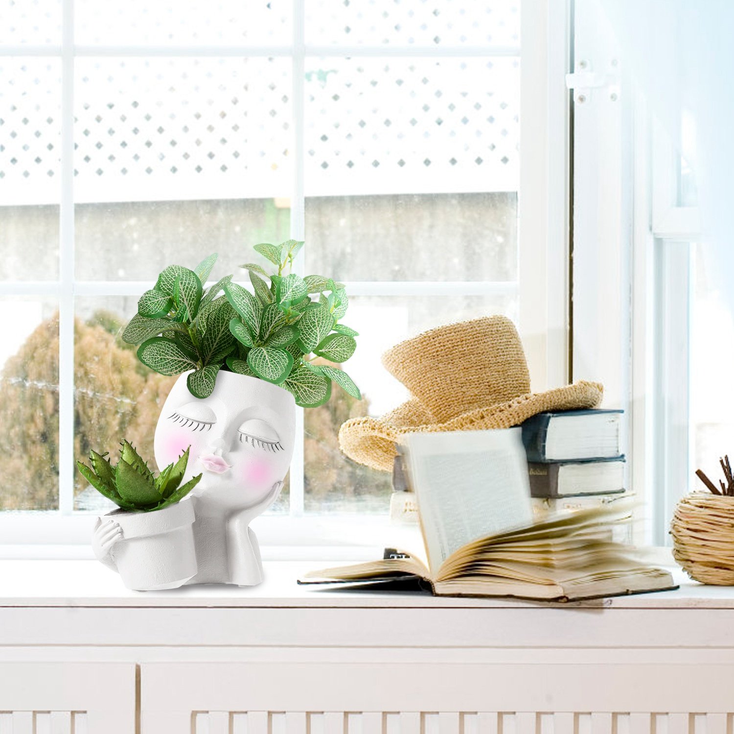> Girl Face Planter Pot Dual Opening Flower Pot With Drainage Hole Lady Head Resin Plant Pot For Succulent Cactus Indoor Outdoor